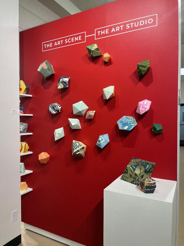 JEWELS are prints, primarily woodcut and or monotype combination, that are laser scored and cut and fabricated into three-dimensional geometric shapes. Many of these have a magnet adheared inside so they can be mounted on a wall.